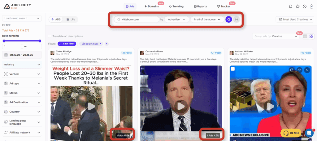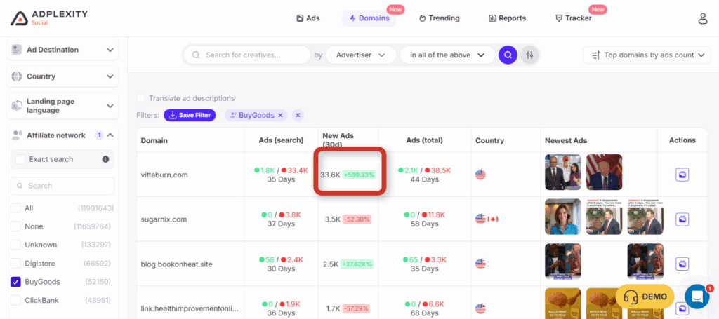 The top offer right now for BuyGoods according to our data seems to be Vitaburn with over 32,000 ads pushed in the last 30 days. That’s a massive signal.