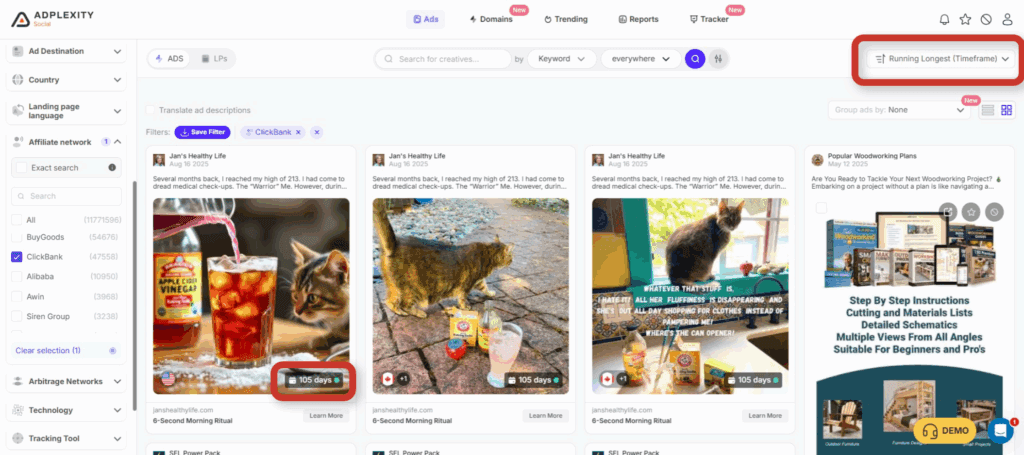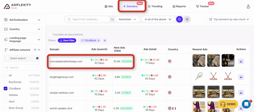 Adplexity has already identified tens of thousands of active ads across these networks. For example, within the last 30 days alone, there were close to 150,000 ads detected across ClickBank, Digistore, and BuyGoods. That’s more than enough data to spot patterns and angles that actually convert.