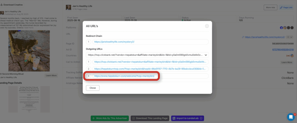 From there, you can open the landing page, study the angle, and trace the exact offer it redirects to.