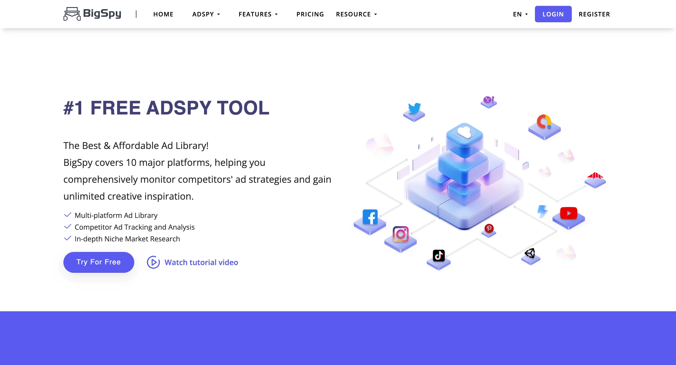 BigSpy stands out for its multi-platform coverage. It supports Facebook, Instagram, TikTok, YouTube, Google, Pinterest, and more, making it one of the broadest tools available.