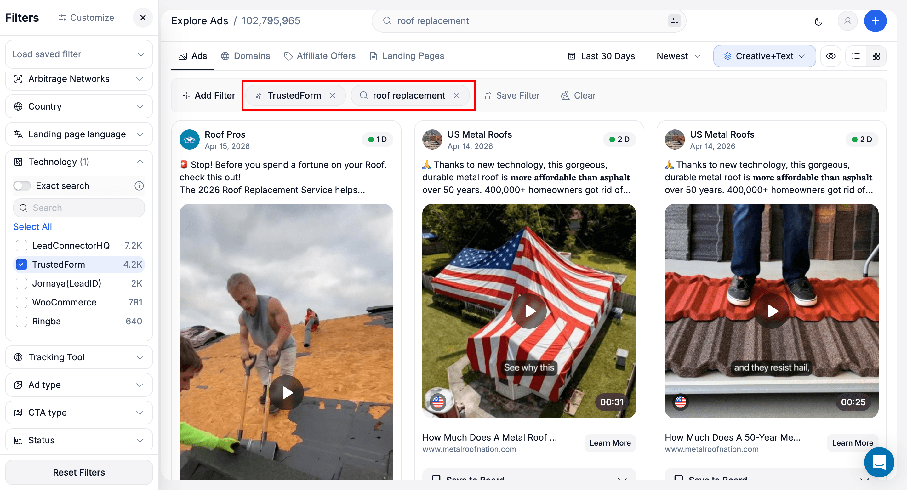 For example, searching “roof replacement” while filtering by TrustedForm immediately surfaces lead generation campaigns using compliance tracking.
