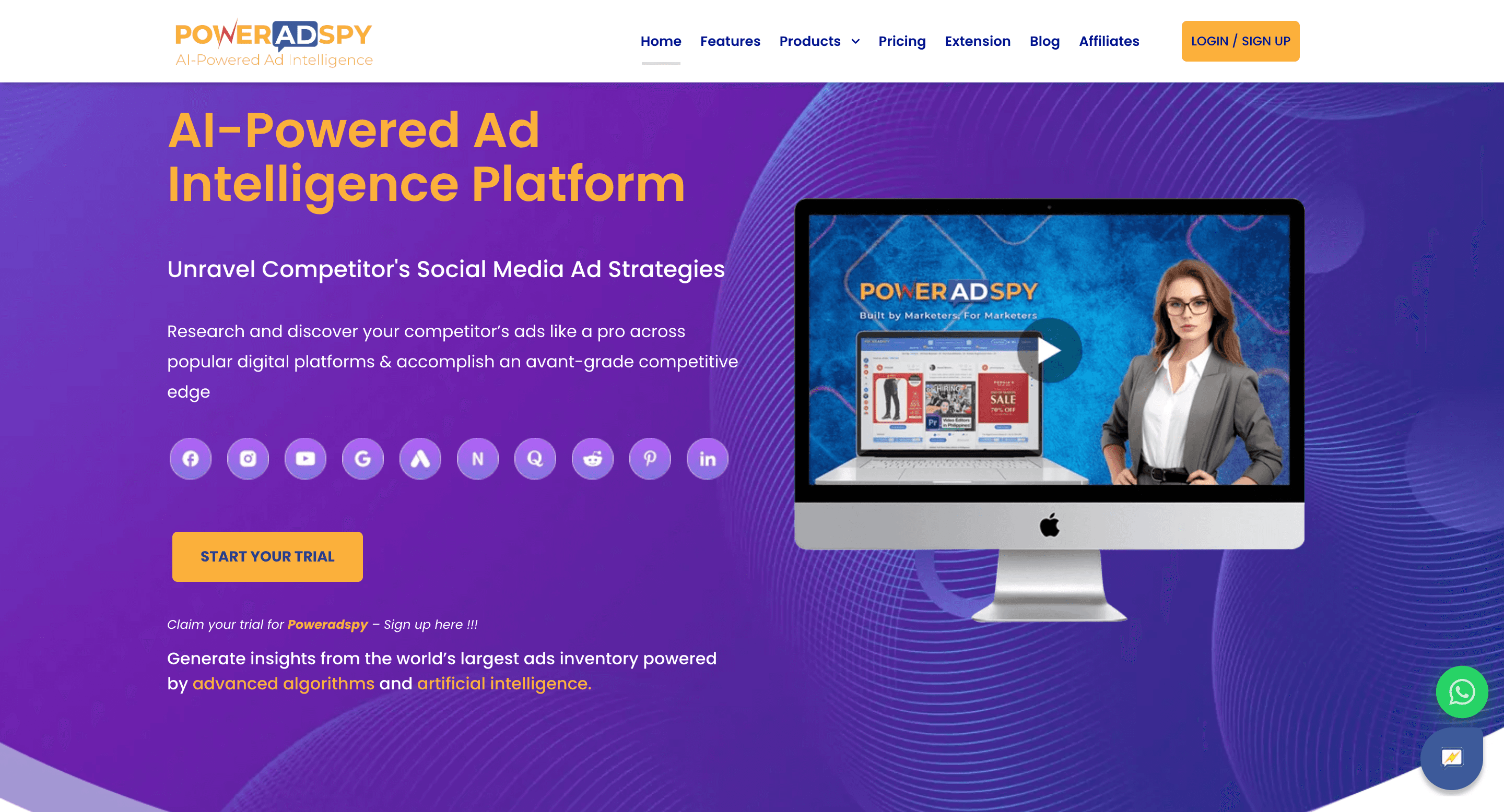 PowerAdSpy covers Facebook, Instagram, YouTube, Google Display, Native, Reddit, Quora, and GIF ads.