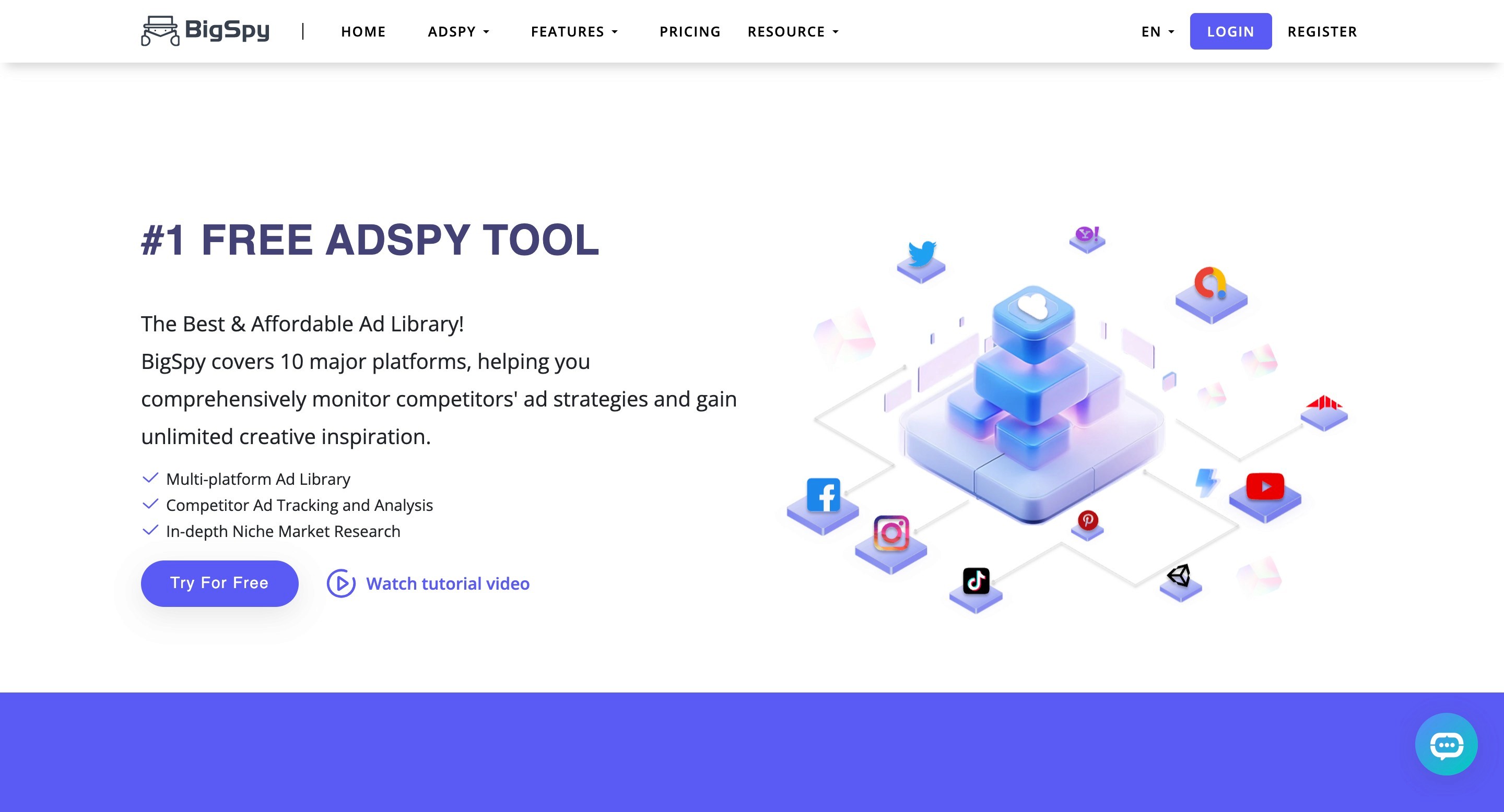 BigSpy's pitch is breadth: Facebook, Instagram, YouTube, TikTok, Twitter, Pinterest, Unity, and AdMob all in one place.