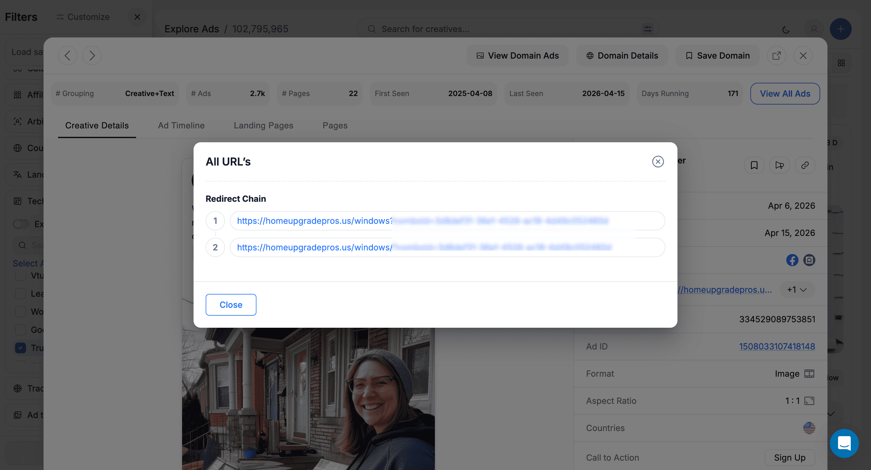 AdPlexity Social automatically follows the full path from the ad click to the final landing page, capturing every intermediate step, outgoing URL, and parameter along the way.