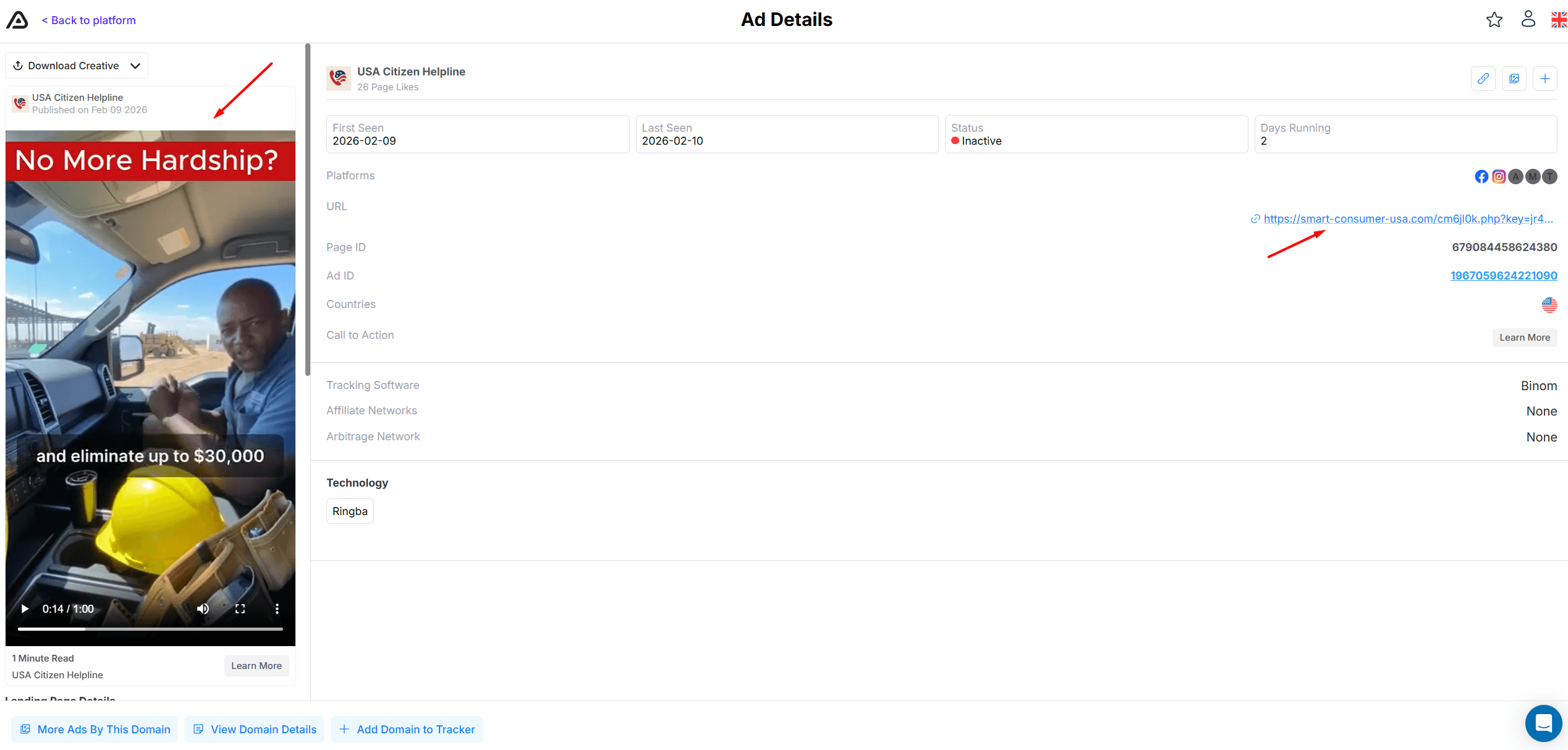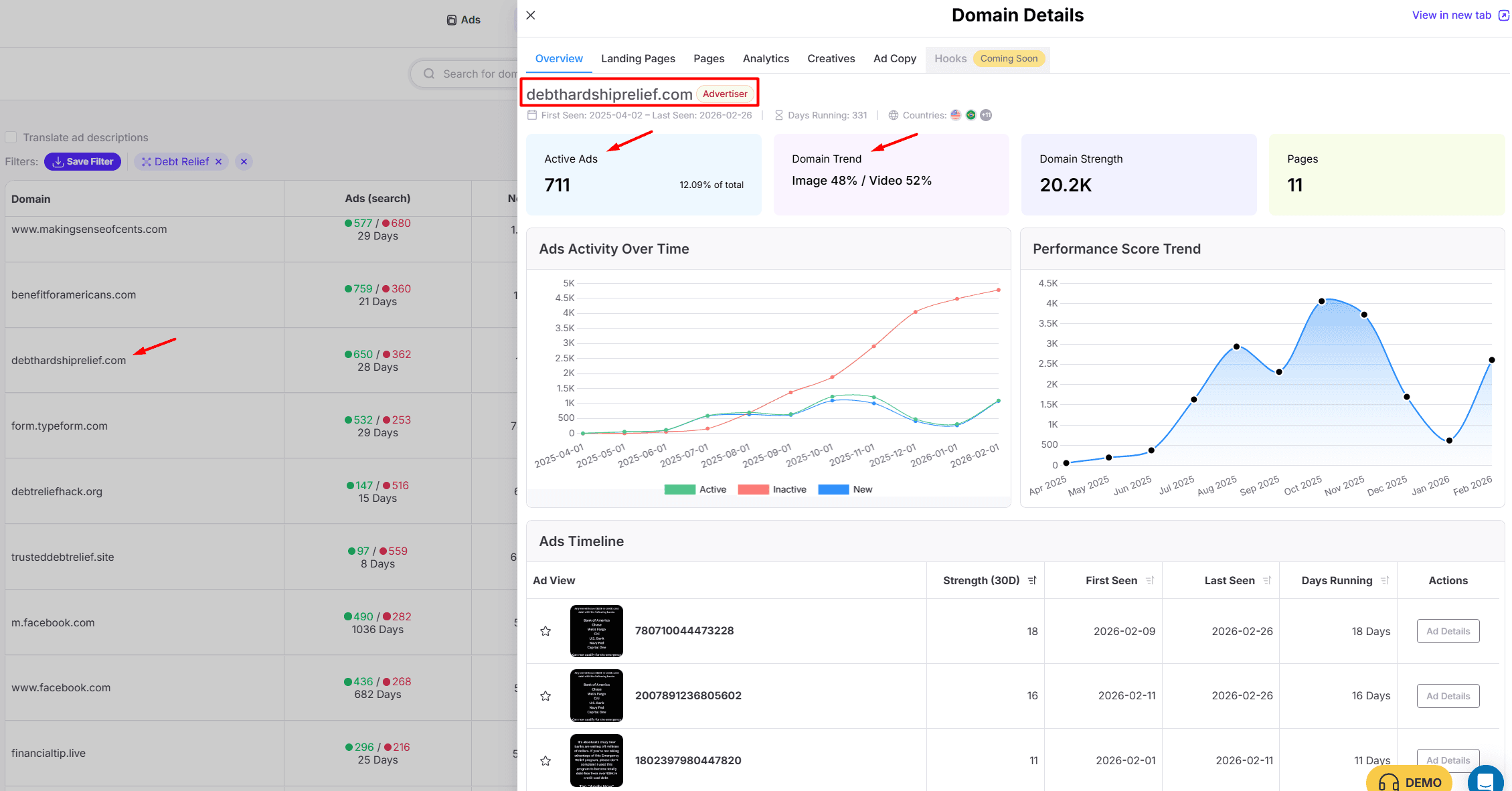 Click into any domain that looks interesting, and you get the full picture: active ad count, creative inventory, landing pages, and redirect chain.