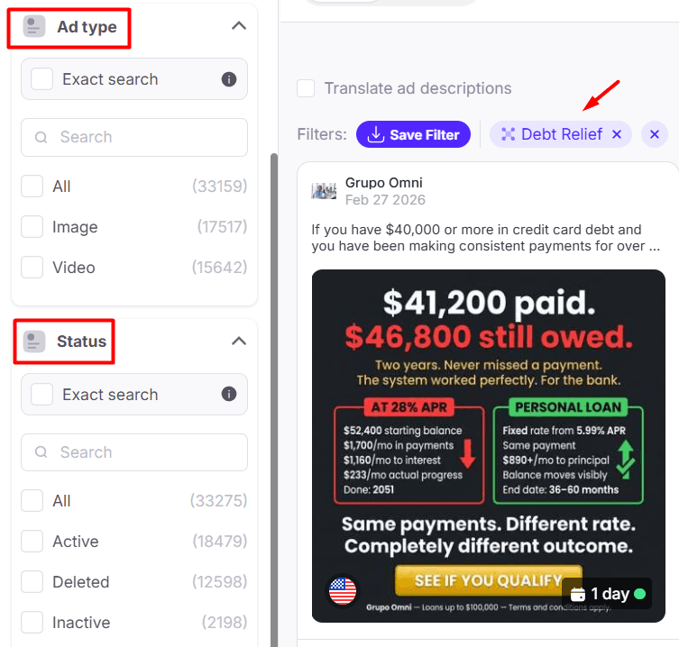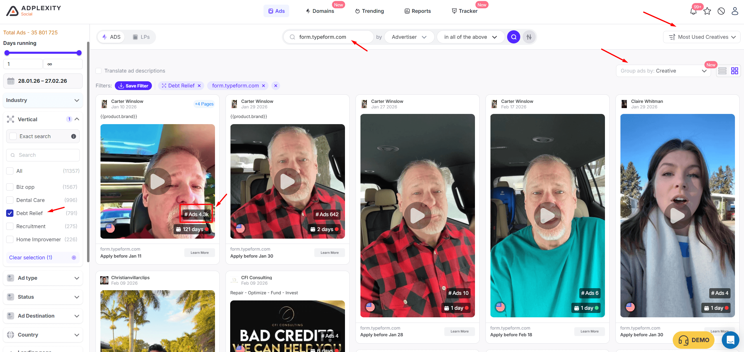 Start with the vertical filter — select debt relief and sort by most used creatives. This immediately surfaces the ads with the most deployment behind them, which is the closest proxy for "working creative" that exists in ad intelligence.