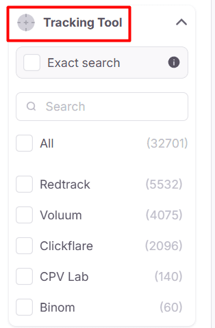 The tracker filters (RedTrack, Voluum, Clickflare) isolate affiliate activity from direct brand advertising.