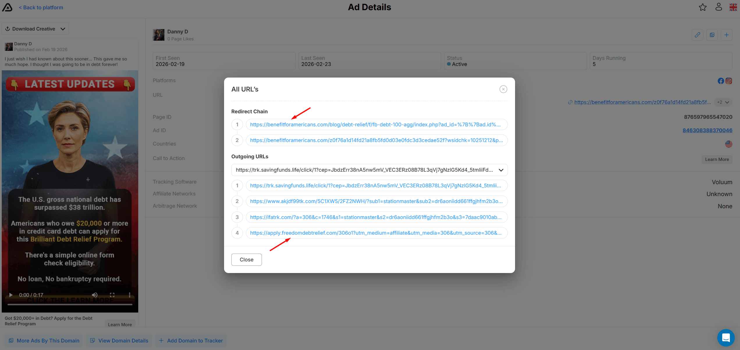 From there, click into any ad and check the landing page and redirect chain. You're looking for the final destination URL to identify which offers are receiving the most traffic.