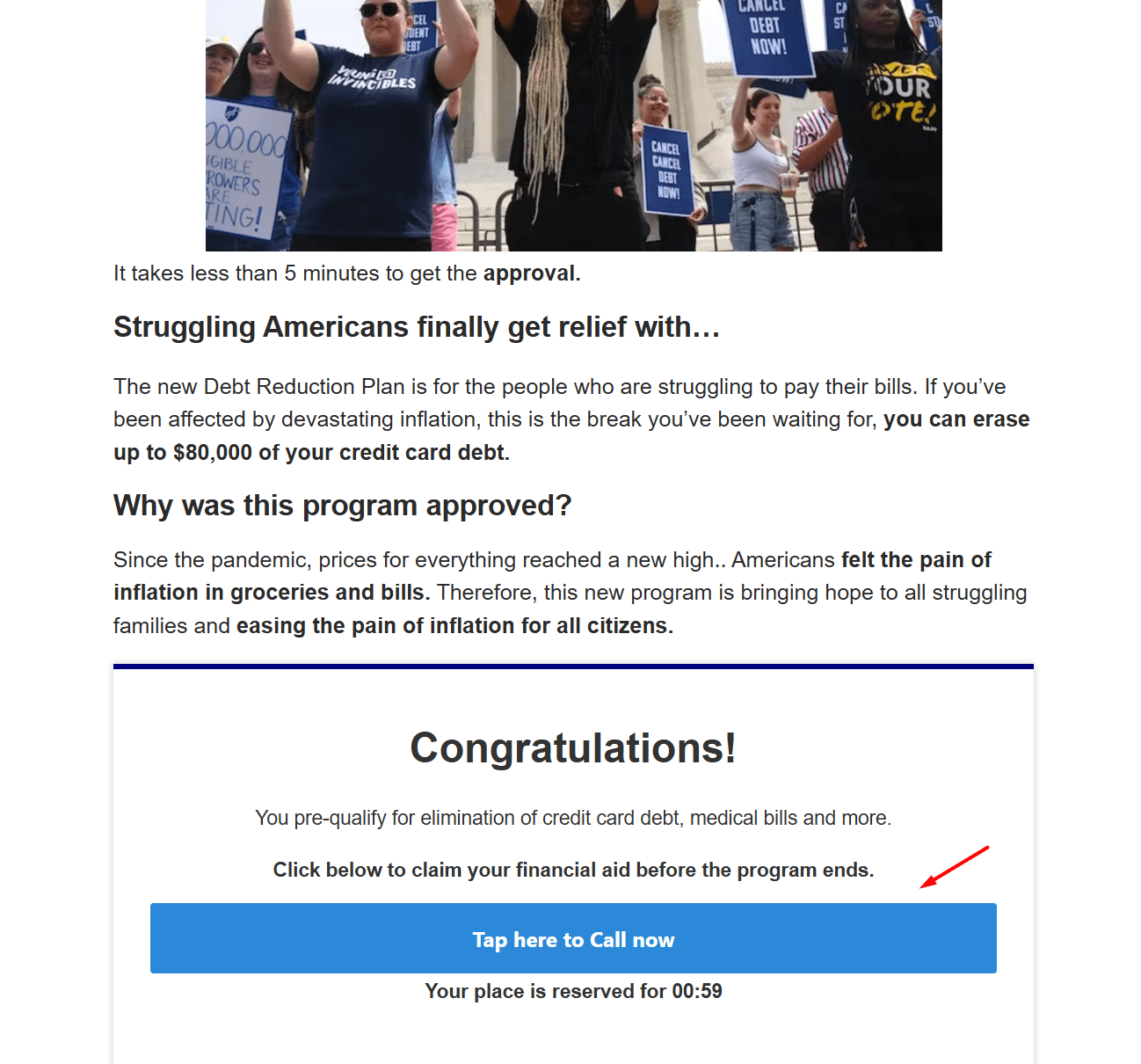 Advertorials are the most common format. These are long-form articles styled to look like editorial content — often mimicking news sites or government announcements — that walk the reader through the debt relief "opportunity" before presenting a CTA.
