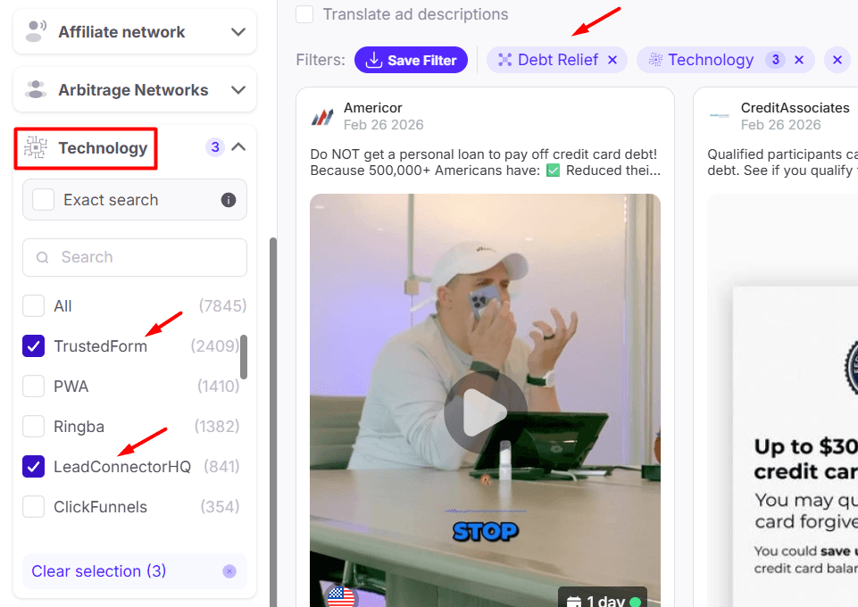 Finally, use the technology filter to segment by business model. Ringba tells you who's running pay-per-call. TrustedForm and LeadConnectorHQ point to lead gen.