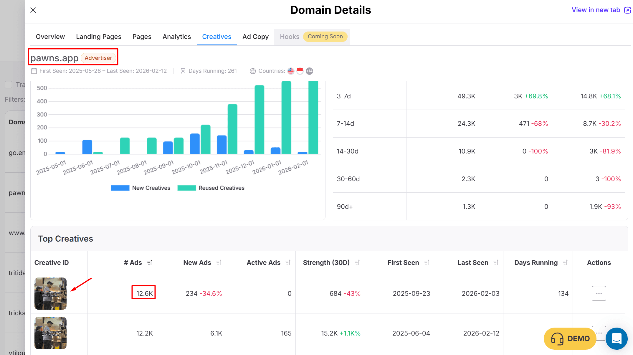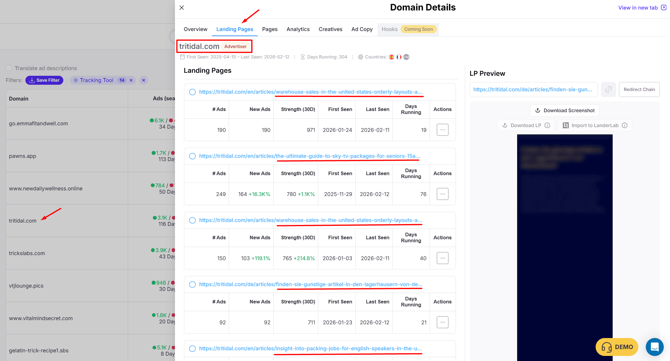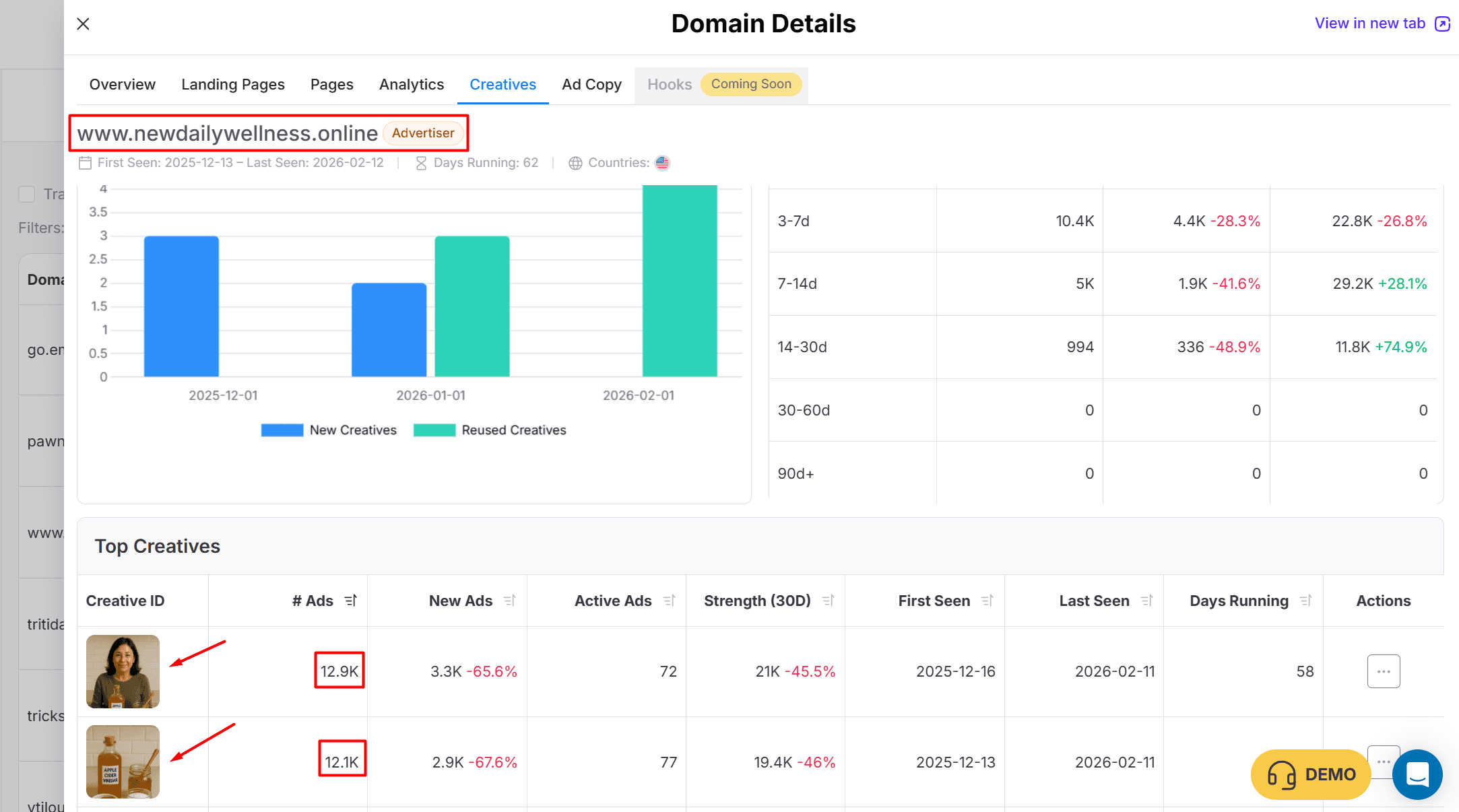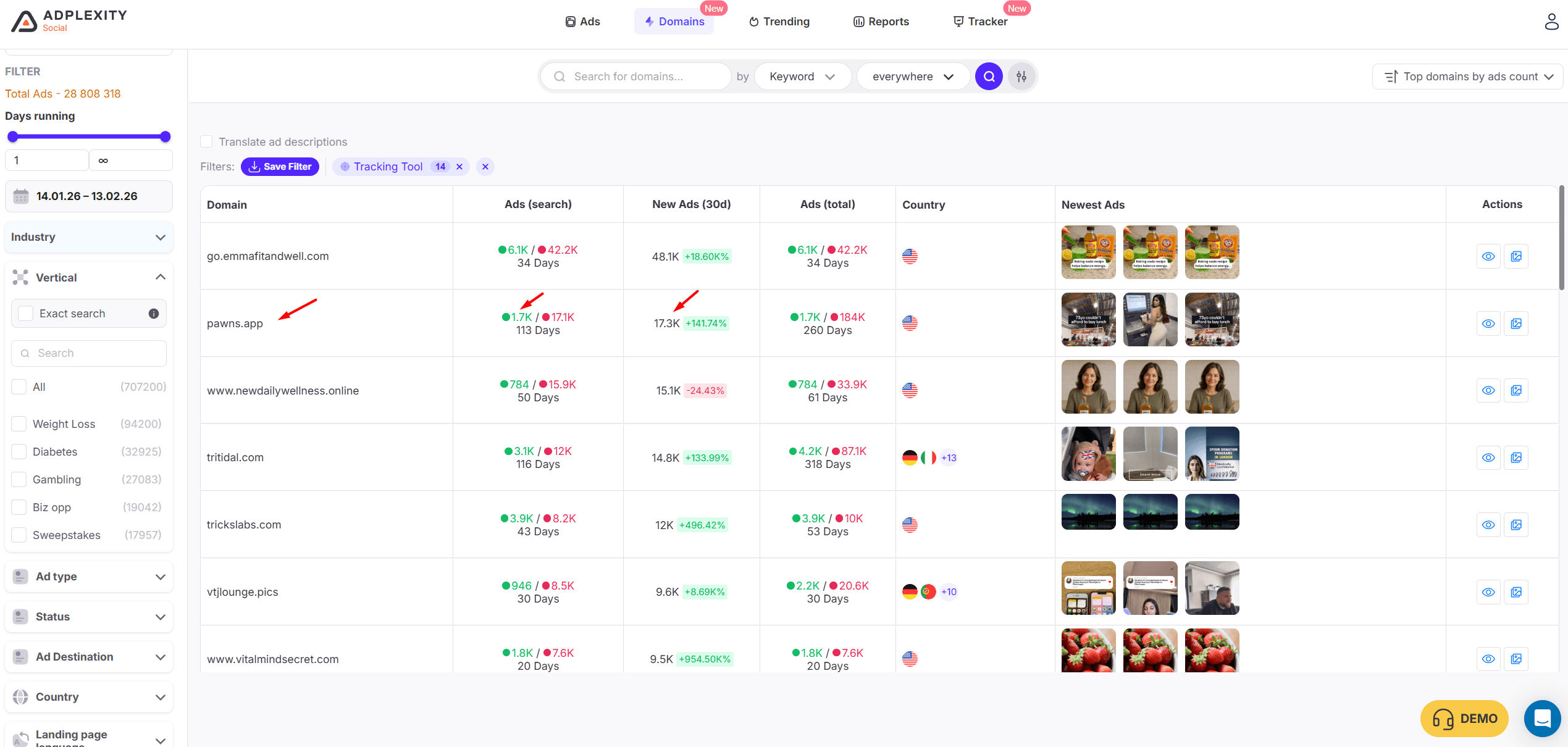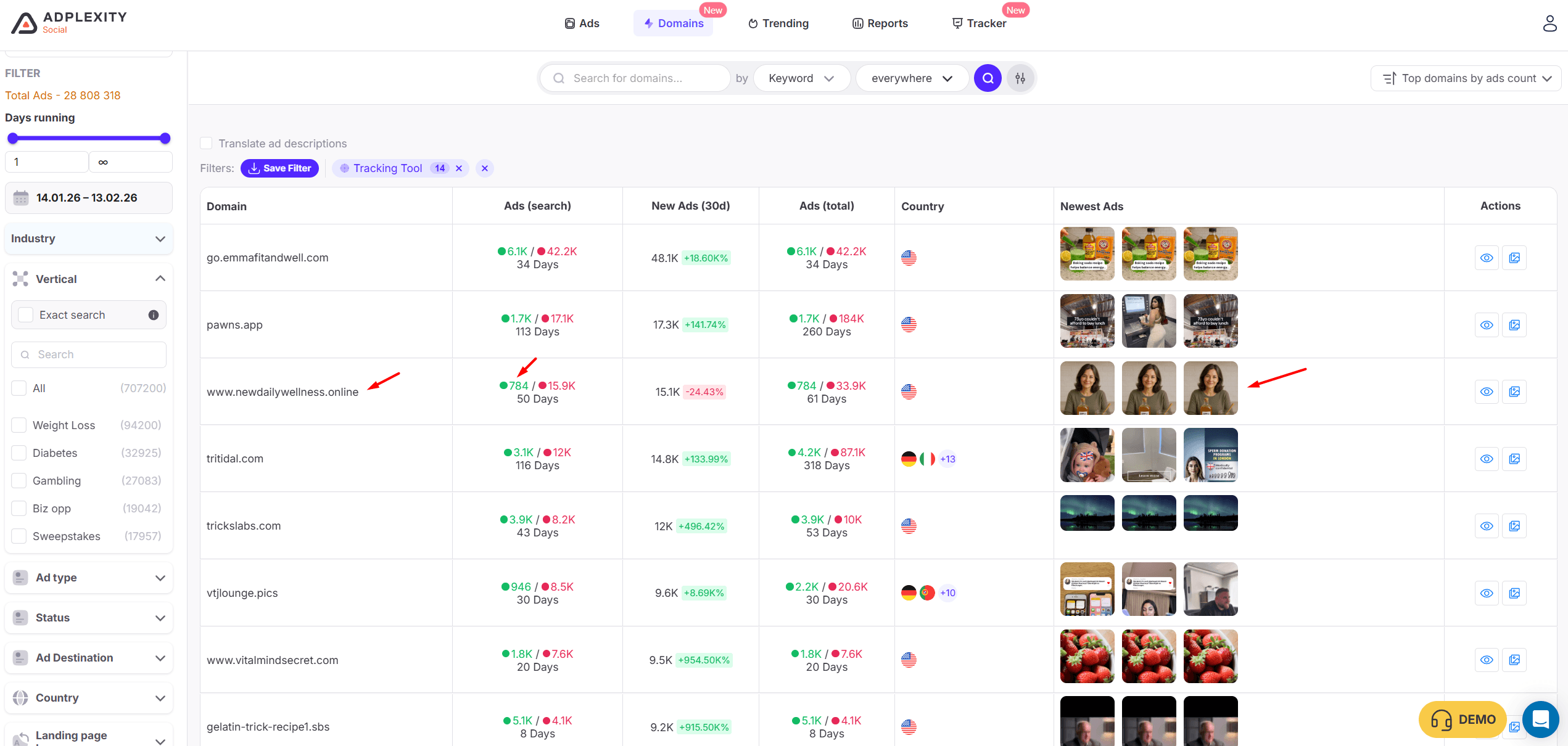 The Volume: We identified 720,000+ affiliate ads in the last 30 days using known affiliate trackers (RedTrack, Binom, ClickFlare, Voluum, etc.).