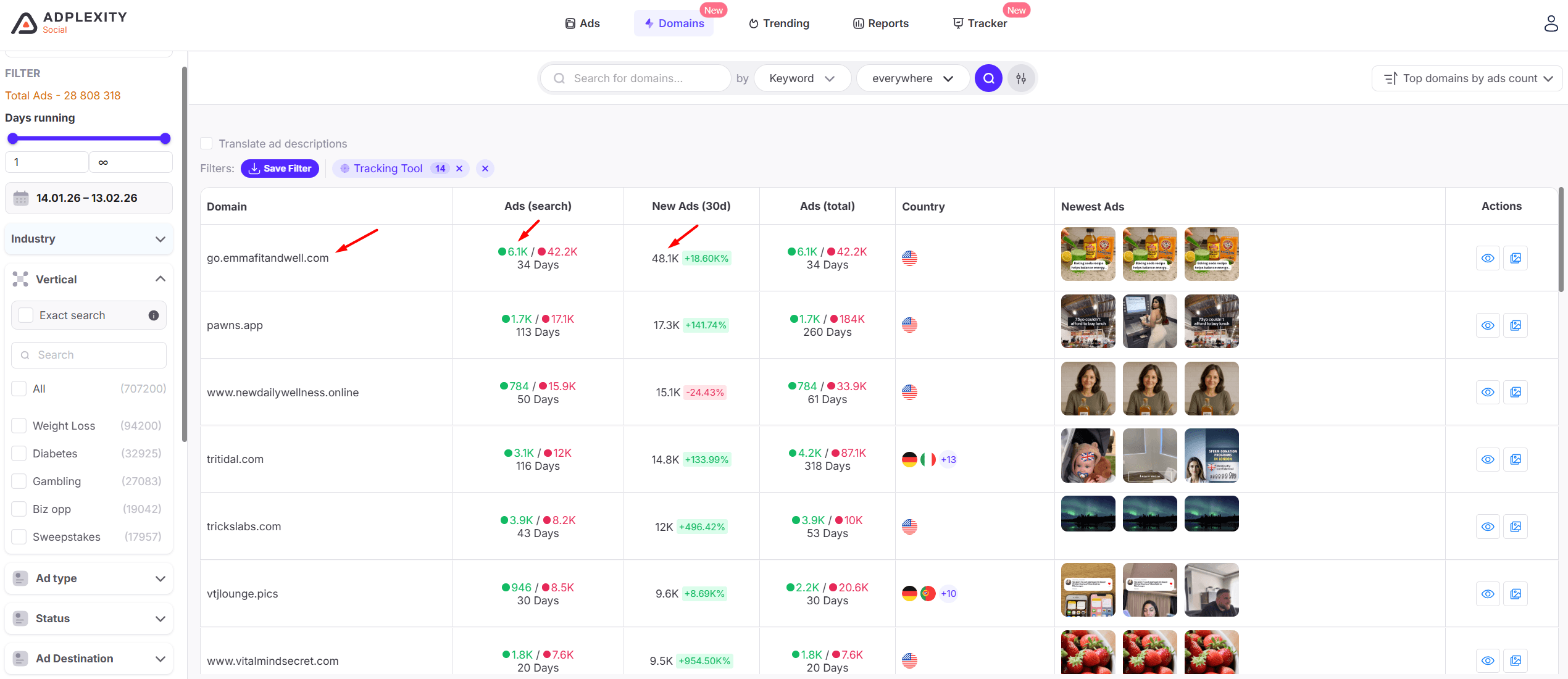 If you search for "Weight Loss," you get everything—brand ads, local gyms, and noise. But if you search by tracking tools: RedTrack, Binom, ClickFlare, etc, you get 100% Affiliate Traffic.
