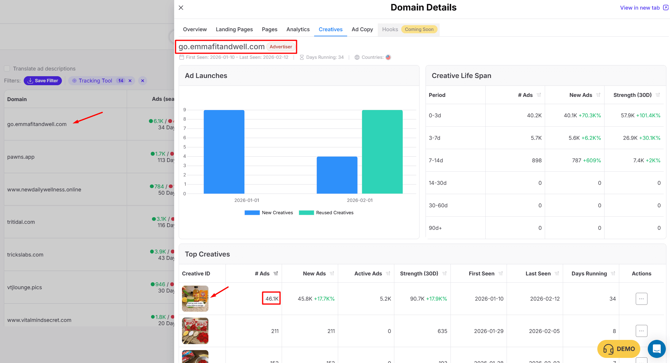 The "Monster" Funnel: We found a single VSL campaign (Emma Fit and Well) with 48,000 ads launched in 40 days.