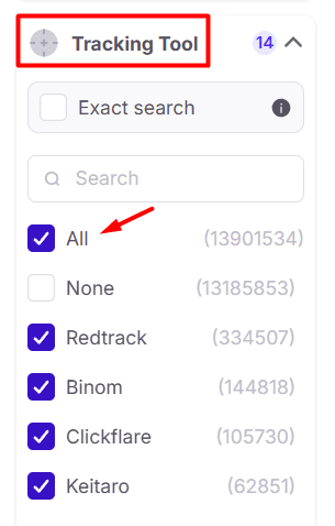 Professional affiliates always use trackers. By filtering by tracking tools, we instantly strip away the big brands and see exactly what the performance marketers are running.