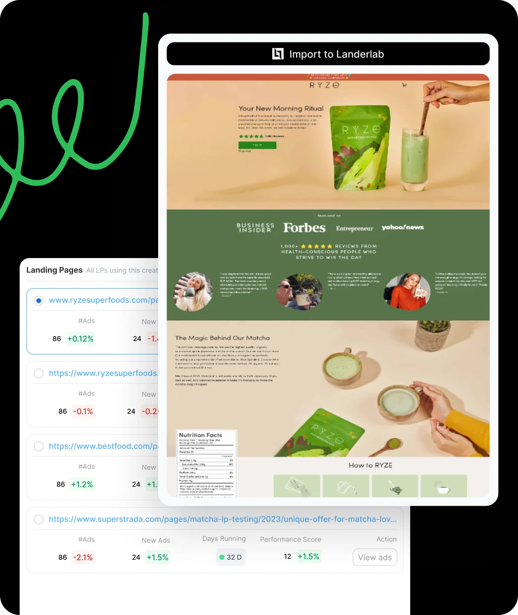 See which LP gets the most ads. 86 ads to one page vs 24 to another? They know which converts better. Download or import to Landerlab in one click.