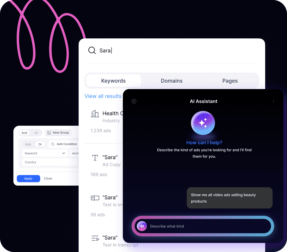 Enter a keyword, brand, domain, or idea and instantly see how it shows up across ads,